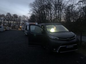 Die Standheizung ist zwar inzwischen an der Batterie angeschlossen, das Bedienteil jedoch noch nicht. Und es fehlt noch der Ausströmer für die warme Luft. Daher hatte ich mir einen Winterschlafsack mitgenommen und habe so meine erste und angenehme Nacht im Aufstelldach verbracht.